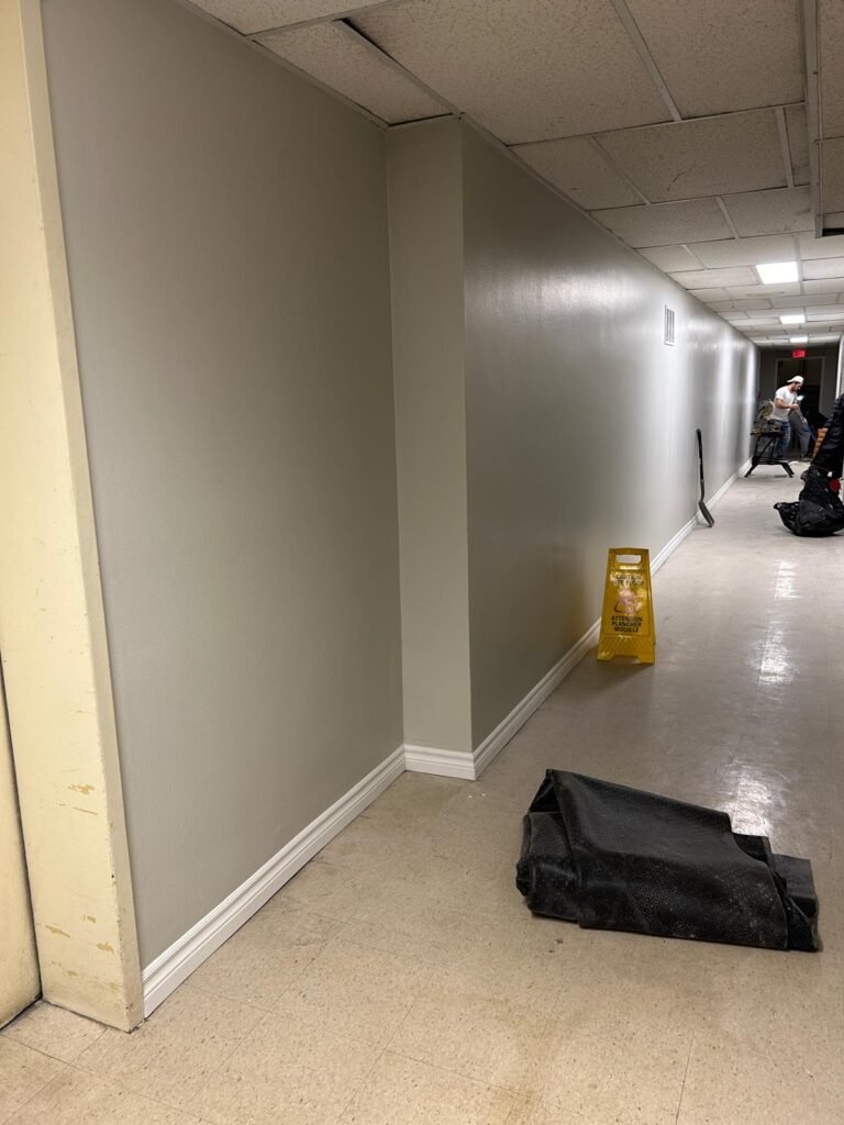 For this project, we refreshed the entire building hallway with a full painting service. All walls and ceilings were carefully prepared and painted to achieve a clean, uniform finish. In addition, the baseboards were repaired and painted, giving the space a polished and modern look.